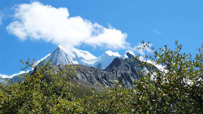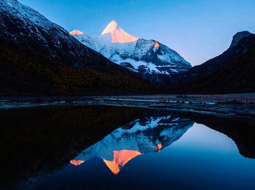 海拔 5958 米,線條流暢、姿態優雅,常年被冰雪覆蓋。1928 年洛克稱其為「世界上最美的雪山」。從 洛絨牛場 可觀其正面全貌,湖光雪影相映成趣。